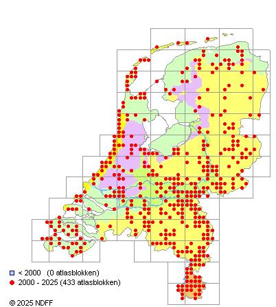 Het aantal atlasblokken (5x5 km) waarin de soort is gemeld binnen een periode van vijf jaar (vanaf 1980) of twintig jaar. Niet gecorrigeerd voor waarnemersinspanning en het aantal doorgegeven waarnemingen kan sterk variƫren per periode, dus een trend in verspreiding kan hier niet direct uit worden afgelezen. Het opgegeven jaartal is het eerste jaar van de periode. Bron: gevalideerde waarnemingen uit de NDFF.