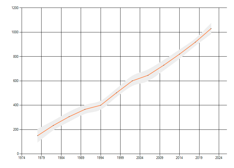 Gemiddelde trend van het aantal kilometerhokken waarin de soort voorkomt, weergegeven als indexcijfer (1975-1978 = 100). De trend is gecorrigeerd voor waarnemersinspanning en geeft de relatieve verandering in het aantal bezette kilometerhokken weer. Voor de berekening worden de data per periode van vier jaar samengenomen. In de grafiek correspondeert ieder punt met het laatste jaar van zo'n periode.