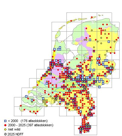 Gemiddelde trend van het aantal kilometerhokken waarin de soort voorkomt, weergegeven als indexcijfer (1975-1978 = 100). De trend is gecorrigeerd voor waarnemersinspanning en geeft de relatieve verandering in het aantal bezette kilometerhokken weer. Voor de berekening worden de data per periode van vier jaar samengenomen. In de grafiek correspondeert ieder punt met het laatste jaar van zo'n periode.