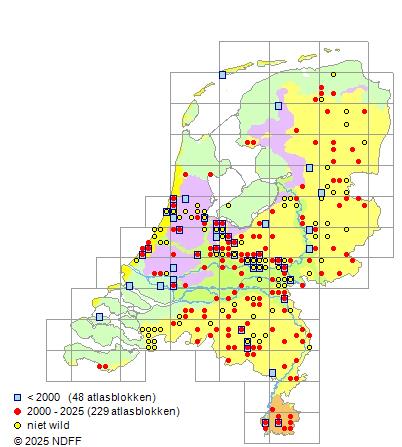 Gemiddelde trend van het aantal kilometerhokken waarin de soort voorkomt, weergegeven als indexcijfer (1975-1978 = 100). De trend is gecorrigeerd voor waarnemersinspanning en geeft de relatieve verandering in het aantal bezette kilometerhokken weer. Voor de berekening worden de data per periode van vier jaar samengenomen. In de grafiek correspondeert ieder punt met het laatste jaar van zo'n periode.