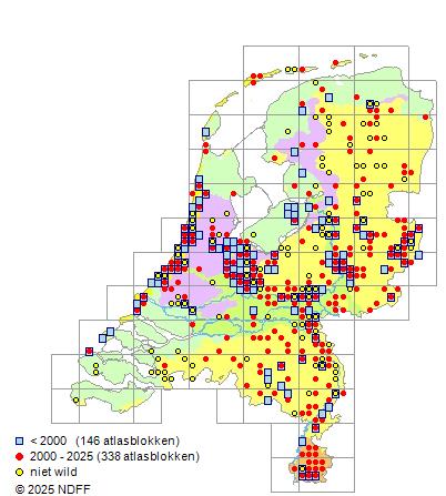 CC BY-NC-SA 3.0 NLVerspreidingNederlandVrij zeldzaam ingeburgerd in de Hollandse duinen, zeldzaam in laagveengebieden, het rivierengebied, Gelderland, Twente, Noord-Brabant en Flevoland en zeer zeldzaam in o.a. Fryslân, Drenthe en Zuid-Limburg.