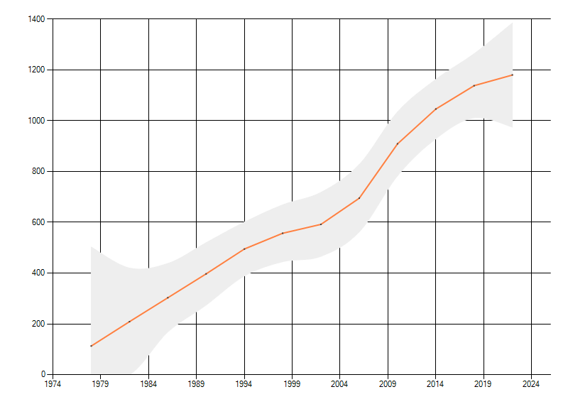 Gemiddelde trend van het aantal kilometerhokken waarin de soort voorkomt, weergegeven als indexcijfer (1975-1978 = 100). De trend is gecorrigeerd voor waarnemersinspanning en geeft de relatieve verandering in het aantal bezette kilometerhokken weer. Voor de berekening worden de data per periode van vier jaar samengenomen. In de grafiek correspondeert ieder punt met het laatste jaar van zo'n periode.