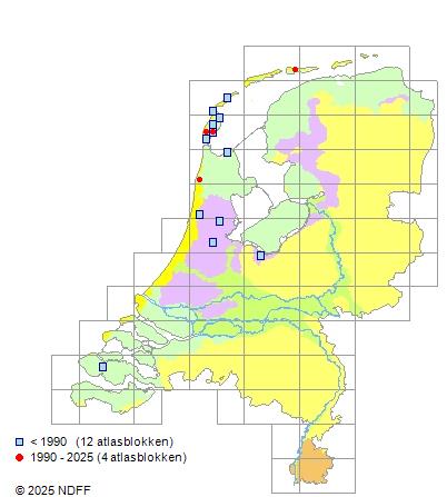 Het aantal atlasblokken (5x5 km) waarin de soort is gemeld binnen een periode van vijf jaar (vanaf 1980) of twintig jaar. Niet gecorrigeerd voor waarnemersinspanning en het aantal doorgegeven waarnemingen kan sterk variëren per periode, dus een trend in verspreiding kan hier niet direct uit worden afgelezen. Het opgegeven jaartal is het eerste jaar van de periode. Bron: gevalideerde waarnemingen uit de NDFF.