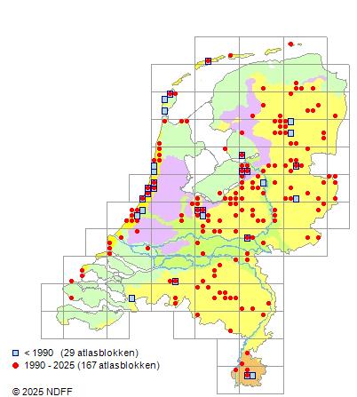 Het aantal atlasblokken (5x5 km) waarin de soort is gemeld binnen een periode van vijf jaar (vanaf 1980) of twintig jaar. Niet gecorrigeerd voor waarnemersinspanning en het aantal doorgegeven waarnemingen kan sterk variëren per periode, dus een trend in verspreiding kan hier niet direct uit worden afgelezen. Het opgegeven jaartal is het eerste jaar van de periode. Bron: gevalideerde waarnemingen uit de NDFF.