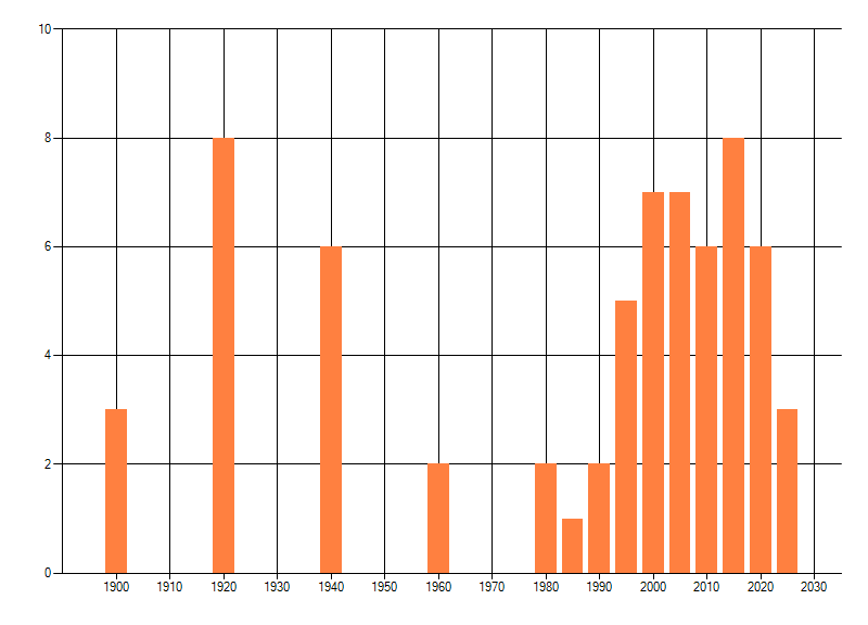 Het aantal atlasblokken (5x5 km) waarin de soort is gemeld binnen een periode van vijf jaar (vanaf 1980) of twintig jaar. Niet gecorrigeerd voor waarnemersinspanning en het aantal doorgegeven waarnemingen kan sterk variëren per periode, dus een trend in verspreiding kan hier niet direct uit worden afgelezen. Het opgegeven jaartal is het eerste jaar van de periode. Bron: gevalideerde waarnemingen uit de NDFF.