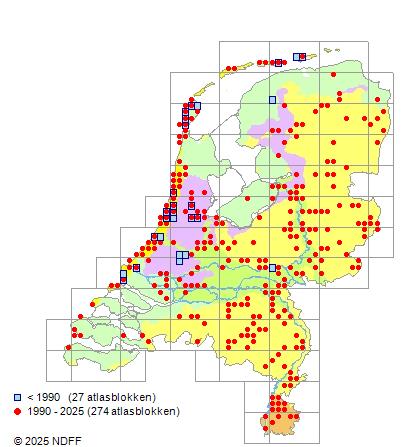 Het aantal atlasblokken (5x5 km) waarin de soort is gemeld binnen een periode van vijf jaar (vanaf 1980) of twintig jaar. Niet gecorrigeerd voor waarnemersinspanning en het aantal doorgegeven waarnemingen kan sterk variëren per periode, dus een trend in verspreiding kan hier niet direct uit worden afgelezen. Het opgegeven jaartal is het eerste jaar van de periode. Bron: gevalideerde waarnemingen uit de NDFF.