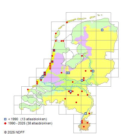 Het aantal atlasblokken (5x5 km) waarin de soort is gemeld binnen een periode van vijf jaar (vanaf 1980) of twintig jaar. Niet gecorrigeerd voor waarnemersinspanning en het aantal doorgegeven waarnemingen kan sterk variëren per periode, dus een trend in verspreiding kan hier niet direct uit worden afgelezen. Het opgegeven jaartal is het eerste jaar van de periode. Bron: gevalideerde waarnemingen uit de NDFF.
