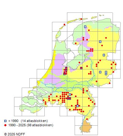 Het aantal atlasblokken (5x5 km) waarin de soort is gemeld binnen een periode van vijf jaar (vanaf 1980) of twintig jaar. Niet gecorrigeerd voor waarnemersinspanning en het aantal doorgegeven waarnemingen kan sterk variëren per periode, dus een trend in verspreiding kan hier niet direct uit worden afgelezen. Het opgegeven jaartal is het eerste jaar van de periode. Bron: gevalideerde waarnemingen uit de NDFF.