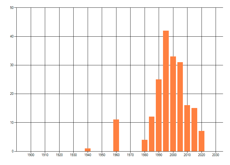 Het aantal atlasblokken (5x5 km) waarin de soort is gemeld binnen een periode van vijf jaar (vanaf 1980) of twintig jaar. Niet gecorrigeerd voor waarnemersinspanning en het aantal doorgegeven waarnemingen kan sterk variëren per periode, dus een trend in verspreiding kan hier niet direct uit worden afgelezen. Het opgegeven jaartal is het eerste jaar van de periode. Bron: gevalideerde waarnemingen uit de NDFF.