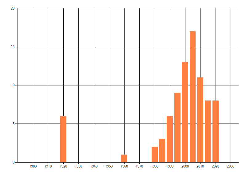Het aantal atlasblokken (5x5 km) waarin de soort is gemeld binnen een periode van vijf jaar (vanaf 1980) of twintig jaar. Niet gecorrigeerd voor waarnemersinspanning en het aantal doorgegeven waarnemingen kan sterk variëren per periode, dus een trend in verspreiding kan hier niet direct uit worden afgelezen. Het opgegeven jaartal is het eerste jaar van de periode. Bron: gevalideerde waarnemingen uit de NDFF.