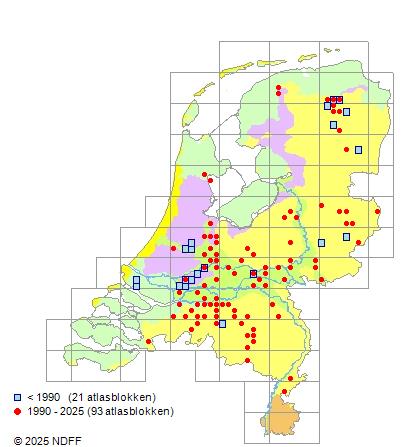 Het aantal atlasblokken (5x5 km) waarin de soort is gemeld binnen een periode van vijf jaar (vanaf 1980) of twintig jaar. Niet gecorrigeerd voor waarnemersinspanning en het aantal doorgegeven waarnemingen kan sterk variëren per periode, dus een trend in verspreiding kan hier niet direct uit worden afgelezen. Het opgegeven jaartal is het eerste jaar van de periode. Bron: gevalideerde waarnemingen uit de NDFF.