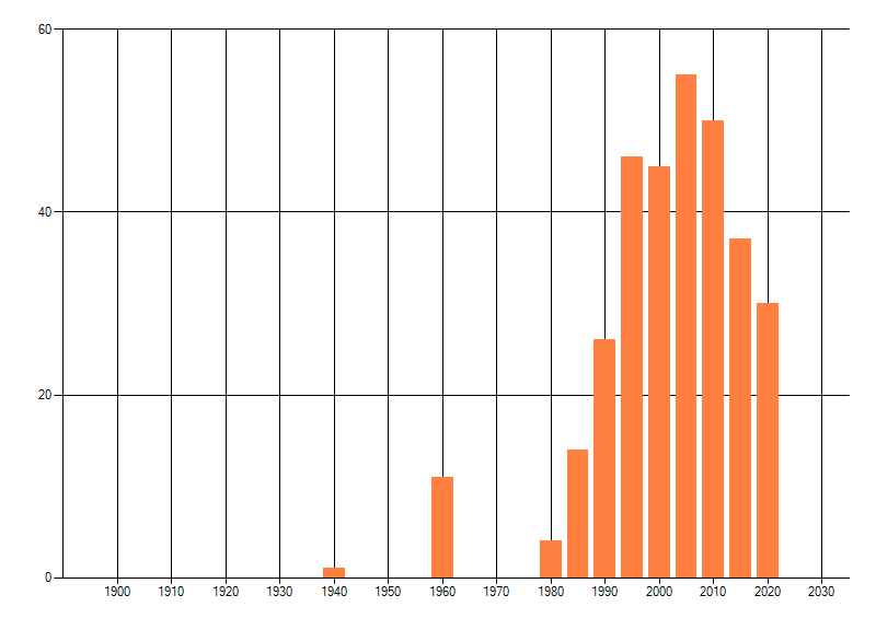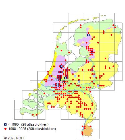 Het aantal atlasblokken (5x5 km) waarin de soort is gemeld binnen een periode van vijf jaar (vanaf 1980) of twintig jaar. Niet gecorrigeerd voor waarnemersinspanning en het aantal doorgegeven waarnemingen kan sterk variëren per periode, dus een trend in verspreiding kan hier niet direct uit worden afgelezen. Het opgegeven jaartal is het eerste jaar van de periode. Bron: gevalideerde waarnemingen uit de NDFF.