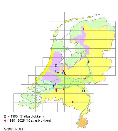 Het aantal atlasblokken (5x5 km) waarin de soort is gemeld binnen een periode van vijf jaar (vanaf 1980) of twintig jaar. Niet gecorrigeerd voor waarnemersinspanning en het aantal doorgegeven waarnemingen kan sterk variëren per periode, dus een trend in verspreiding kan hier niet direct uit worden afgelezen. Het opgegeven jaartal is het eerste jaar van de periode. Bron: gevalideerde waarnemingen uit de NDFF.