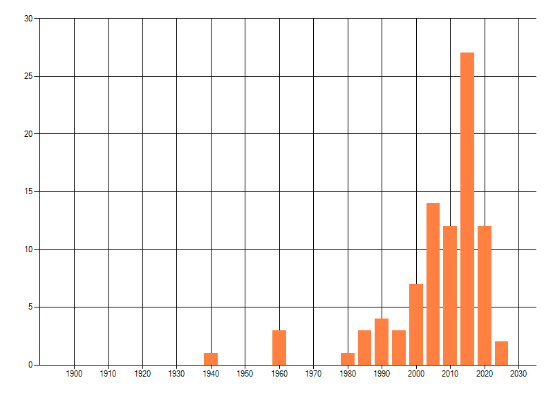 Het aantal atlasblokken (5x5 km) waarin de soort is gemeld binnen een periode van vijf jaar (vanaf 1980) of twintig jaar. Niet gecorrigeerd voor waarnemersinspanning en het aantal doorgegeven waarnemingen kan sterk variëren per periode, dus een trend in verspreiding kan hier niet direct uit worden afgelezen. Het opgegeven jaartal is het eerste jaar van de periode. Bron: gevalideerde waarnemingen uit de NDFF.