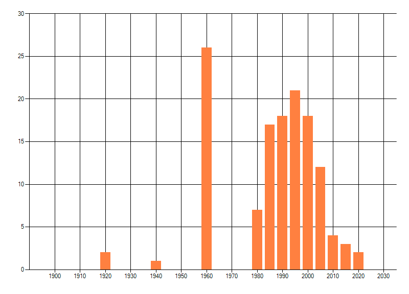 Het aantal atlasblokken (5x5 km) waarin de soort is gemeld binnen een periode van vijf jaar (vanaf 1980) of twintig jaar. Niet gecorrigeerd voor waarnemersinspanning en het aantal doorgegeven waarnemingen kan sterk variëren per periode, dus een trend in verspreiding kan hier niet direct uit worden afgelezen. Het opgegeven jaartal is het eerste jaar van de periode. Bron: gevalideerde waarnemingen uit de NDFF.