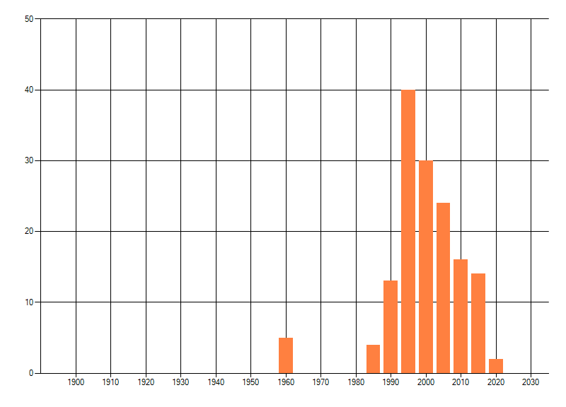 Het aantal atlasblokken (5x5 km) waarin de soort is gemeld binnen een periode van vijf jaar (vanaf 1980) of twintig jaar. Niet gecorrigeerd voor waarnemersinspanning en het aantal doorgegeven waarnemingen kan sterk variëren per periode, dus een trend in verspreiding kan hier niet direct uit worden afgelezen. Het opgegeven jaartal is het eerste jaar van de periode. Bron: gevalideerde waarnemingen uit de NDFF.