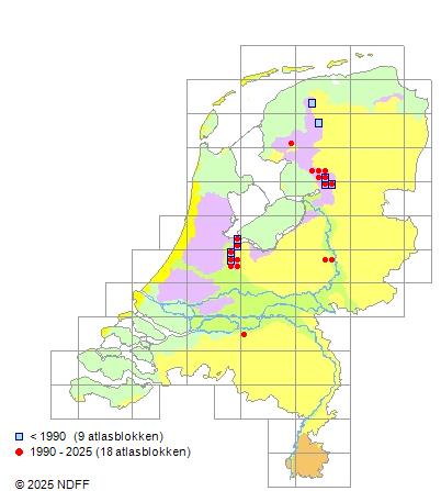 Het aantal atlasblokken (5x5 km) waarin de soort is gemeld binnen een periode van vijf jaar (vanaf 1980) of twintig jaar. Niet gecorrigeerd voor waarnemersinspanning en het aantal doorgegeven waarnemingen kan sterk variëren per periode, dus een trend in verspreiding kan hier niet direct uit worden afgelezen. Het opgegeven jaartal is het eerste jaar van de periode. Bron: gevalideerde waarnemingen uit de NDFF.
