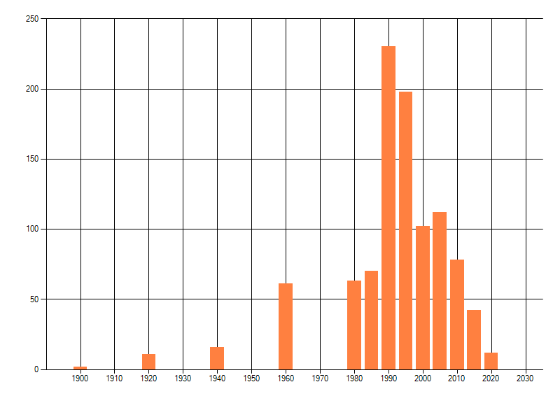 Het aantal atlasblokken (5x5 km) waarin de soort is gemeld binnen een periode van vijf jaar (vanaf 1980) of twintig jaar. Niet gecorrigeerd voor waarnemersinspanning en het aantal doorgegeven waarnemingen kan sterk variëren per periode, dus een trend in verspreiding kan hier niet direct uit worden afgelezen. Het opgegeven jaartal is het eerste jaar van de periode. Bron: gevalideerde waarnemingen uit de NDFF.