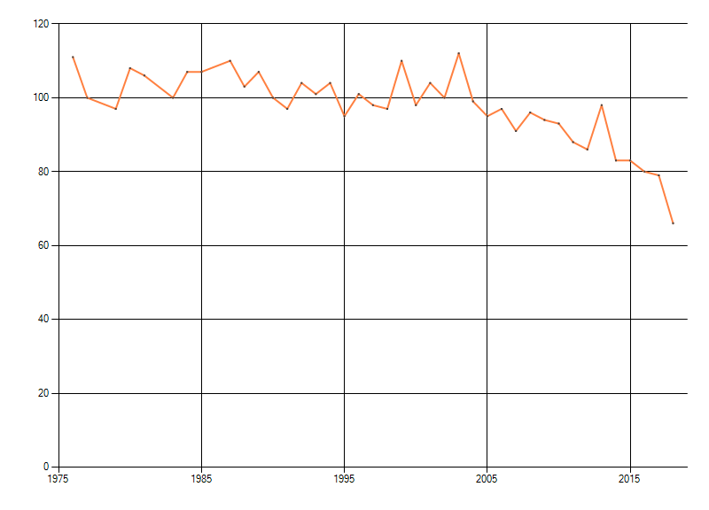 Gemiddelde trend van het aantal kilometerhokken waarin de soort voorkomt, weergegeven als indexcijfer (1975-1978 = 100). De trend is gecorrigeerd voor waarnemersinspanning en geeft de relatieve verandering in het aantal bezette kilometerhokken weer. Voor de berekening worden de data per periode van vier jaar samengenomen. In de grafiek correspondeert ieder punt met het laatste jaar van zo'n periode.