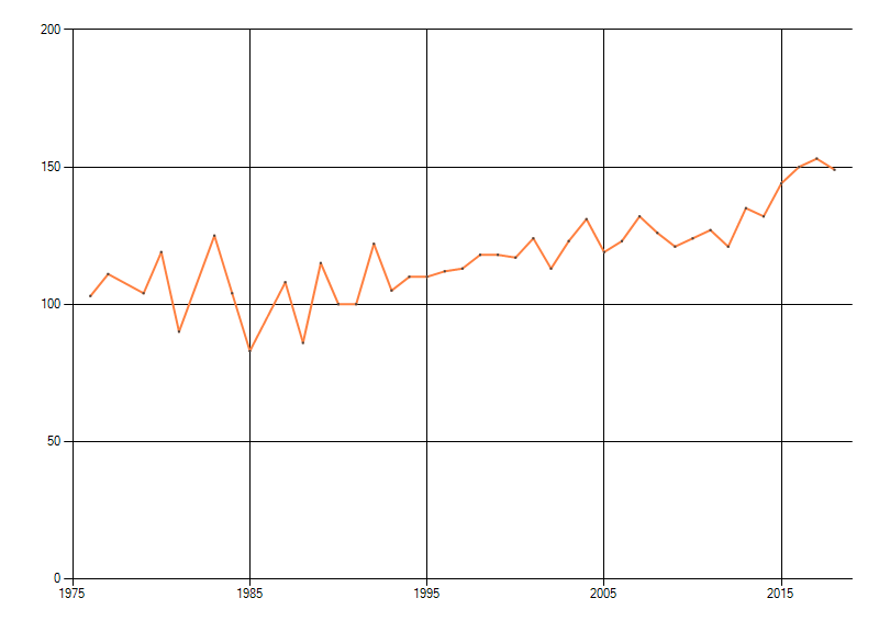 Gemiddelde trend van het aantal kilometerhokken waarin de soort voorkomt, weergegeven als indexcijfer (1975-1978 = 100). De trend is gecorrigeerd voor waarnemersinspanning en geeft de relatieve verandering in het aantal bezette kilometerhokken weer. Voor de berekening worden de data per periode van vier jaar samengenomen. In de grafiek correspondeert ieder punt met het laatste jaar van zo'n periode.