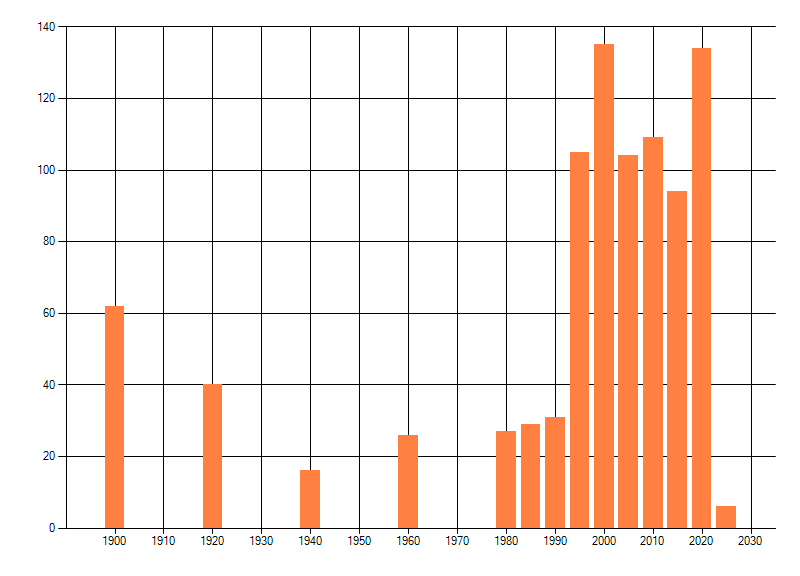 Het aantal atlasblokken (5x5 km) waarin de soort is gemeld binnen een periode van vijf jaar (vanaf 1980) of twintig jaar. Niet gecorrigeerd voor waarnemersinspanning en het aantal doorgegeven waarnemingen kan sterk variëren per periode, dus een trend in verspreiding kan hier niet direct uit worden afgelezen. Het opgegeven jaartal is het eerste jaar van de periode. Bron: gevalideerde waarnemingen uit de NDFF.