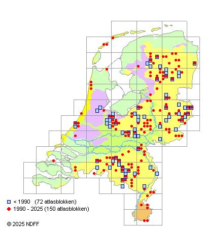 Het aantal atlasblokken (5x5 km) waarin de soort is gemeld binnen een periode van vijf jaar (vanaf 1980) of twintig jaar. Niet gecorrigeerd voor waarnemersinspanning en het aantal doorgegeven waarnemingen kan sterk variëren per periode, dus een trend in verspreiding kan hier niet direct uit worden afgelezen. Het opgegeven jaartal is het eerste jaar van de periode. Bron: gevalideerde waarnemingen uit de NDFF.