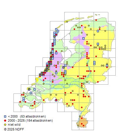 Het aantal atlasblokken (5x5 km) waarin de soort is gemeld binnen een periode van vijf jaar (vanaf 1980) of twintig jaar. Niet gecorrigeerd voor waarnemersinspanning en het aantal doorgegeven waarnemingen kan sterk variëren per periode, dus een trend in verspreiding kan hier niet direct uit worden afgelezen. Het opgegeven jaartal is het eerste jaar van de periode. Bron: gevalideerde waarnemingen uit de NDFF.