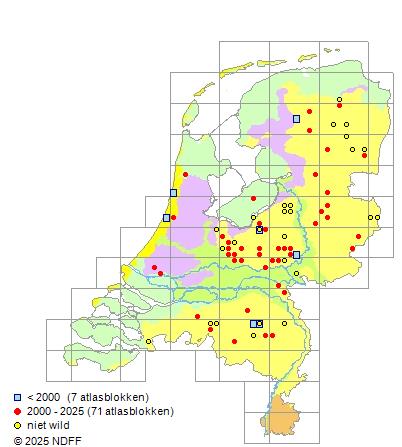 Het aantal atlasblokken (5x5 km) waarin de soort is gemeld binnen een periode van vijf jaar (vanaf 1980) of twintig jaar. Niet gecorrigeerd voor waarnemersinspanning en het aantal doorgegeven waarnemingen kan sterk variëren per periode, dus een trend in verspreiding kan hier niet direct uit worden afgelezen. Het opgegeven jaartal is het eerste jaar van de periode. Bron: gevalideerde waarnemingen uit de NDFF.