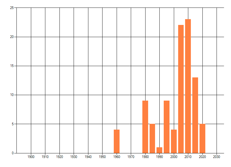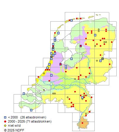 Het aantal atlasblokken (5x5 km) waarin de soort is gemeld binnen een periode van vijf jaar (vanaf 1980) of twintig jaar. Niet gecorrigeerd voor waarnemersinspanning en het aantal doorgegeven waarnemingen kan sterk variëren per periode, dus een trend in verspreiding kan hier niet direct uit worden afgelezen. Het opgegeven jaartal is het eerste jaar van de periode. Bron: gevalideerde waarnemingen uit de NDFF.