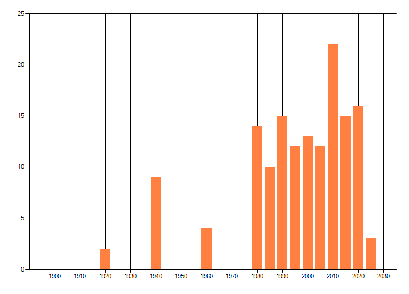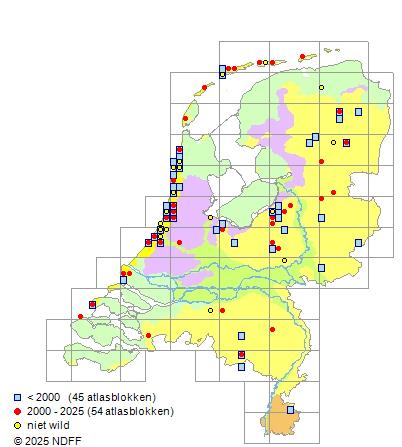 Het aantal atlasblokken (5x5 km) waarin de soort is gemeld binnen een periode van vijf jaar (vanaf 1980) of twintig jaar. Niet gecorrigeerd voor waarnemersinspanning en het aantal doorgegeven waarnemingen kan sterk variëren per periode, dus een trend in verspreiding kan hier niet direct uit worden afgelezen. Het opgegeven jaartal is het eerste jaar van de periode. Bron: gevalideerde waarnemingen uit de NDFF.