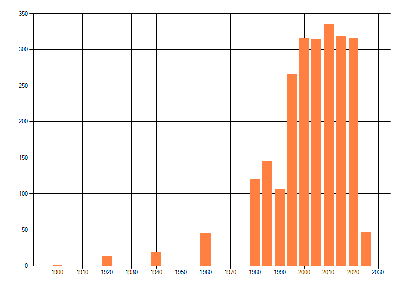 Het aantal atlasblokken (5x5 km) waarin de soort is gemeld binnen een periode van vijf jaar (vanaf 1980) of twintig jaar. Niet gecorrigeerd voor waarnemersinspanning en het aantal doorgegeven waarnemingen kan sterk variëren per periode, dus een trend in verspreiding kan hier niet direct uit worden afgelezen. Het opgegeven jaartal is het eerste jaar van de periode. Bron: gevalideerde waarnemingen uit de NDFF.