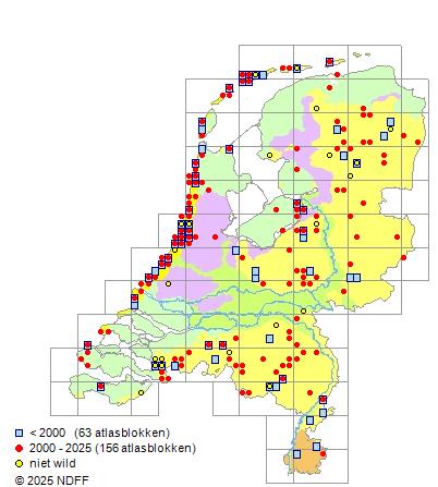 Het aantal atlasblokken (5x5 km) waarin de soort is gemeld binnen een periode van vijf jaar (vanaf 1980) of twintig jaar. Niet gecorrigeerd voor waarnemersinspanning en het aantal doorgegeven waarnemingen kan sterk variëren per periode, dus een trend in verspreiding kan hier niet direct uit worden afgelezen. Het opgegeven jaartal is het eerste jaar van de periode. Bron: gevalideerde waarnemingen uit de NDFF.
