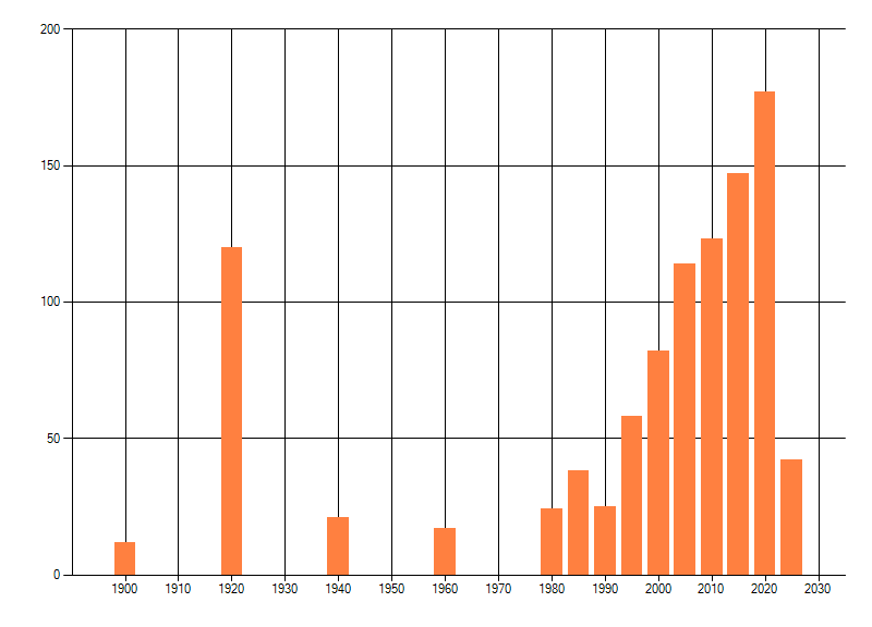 Het aantal atlasblokken (5x5 km) waarin de soort is gemeld binnen een periode van vijf jaar (vanaf 1980) of twintig jaar. Niet gecorrigeerd voor waarnemersinspanning en het aantal doorgegeven waarnemingen kan sterk variëren per periode, dus een trend in verspreiding kan hier niet direct uit worden afgelezen. Het opgegeven jaartal is het eerste jaar van de periode. Bron: gevalideerde waarnemingen uit de NDFF.