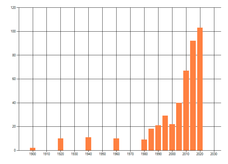 Het aantal atlasblokken (5x5 km) waarin de soort is gemeld binnen een periode van vijf jaar (vanaf 1980) of twintig jaar. Niet gecorrigeerd voor waarnemersinspanning en het aantal doorgegeven waarnemingen kan sterk variëren per periode, dus een trend in verspreiding kan hier niet direct uit worden afgelezen. Het opgegeven jaartal is het eerste jaar van de periode. Bron: gevalideerde waarnemingen uit de NDFF.