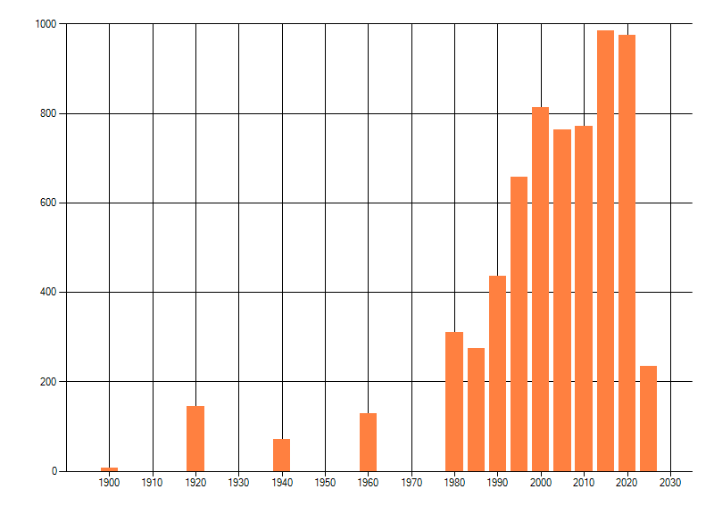 Het aantal atlasblokken (5x5 km) waarin de soort is gemeld binnen een periode van vijf jaar (vanaf 1980) of twintig jaar. Niet gecorrigeerd voor waarnemersinspanning en het aantal doorgegeven waarnemingen kan sterk variëren per periode, dus een trend in verspreiding kan hier niet direct uit worden afgelezen. Het opgegeven jaartal is het eerste jaar van de periode. Bron: gevalideerde waarnemingen uit de NDFF.