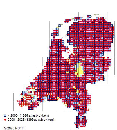 Het aantal atlasblokken (5x5 km) waarin de soort is gemeld binnen een periode van vijf jaar (vanaf 1980) of twintig jaar. Niet gecorrigeerd voor waarnemersinspanning en het aantal doorgegeven waarnemingen kan sterk variëren per periode, dus een trend in verspreiding kan hier niet direct uit worden afgelezen. Het opgegeven jaartal is het eerste jaar van de periode. Bron: gevalideerde waarnemingen uit de NDFF.