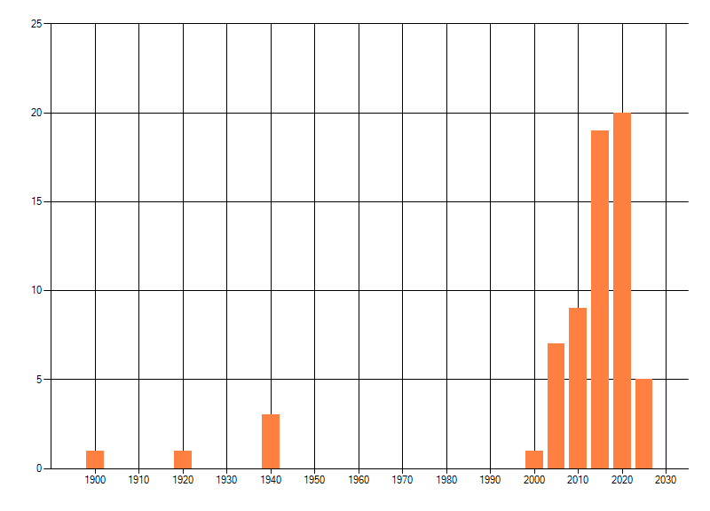 Het aantal atlasblokken (5x5 km) waarin de soort is gemeld binnen een periode van vijf jaar (vanaf 1980) of twintig jaar. Niet gecorrigeerd voor waarnemersinspanning en het aantal doorgegeven waarnemingen kan sterk variëren per periode, dus een trend in verspreiding kan hier niet direct uit worden afgelezen. Het opgegeven jaartal is het eerste jaar van de periode. Bron: gevalideerde waarnemingen uit de NDFF.
