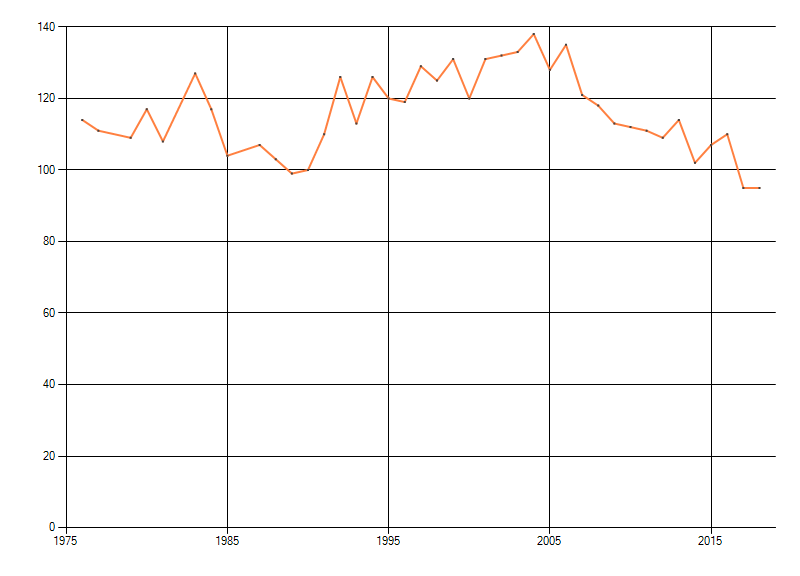 In de grafiek correspondeert ieder punt met het laatste jaar van zo'n periode.
