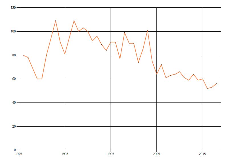 Gemiddelde trend van het aantal kilometerhokken waarin de soort voorkomt, weergegeven als indexcijfer (1975-1978 = 100). De trend is gecorrigeerd voor waarnemersinspanning en geeft de relatieve verandering in het aantal bezette kilometerhokken weer. Voor de berekening worden de data per periode van vier jaar samengenomen. In de grafiek correspondeert ieder punt met het laatste jaar van zo'n periode.