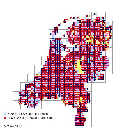 Het aantal atlasblokken (5x5 km) waarin de soort is gemeld binnen een periode van vijf jaar (vanaf 1980) of twintig jaar. Niet gecorrigeerd voor waarnemersinspanning en het aantal doorgegeven waarnemingen kan sterk variƫren per periode, dus een trend in verspreiding kan hier niet direct uit worden afgelezen. Het opgegeven jaartal is het eerste jaar van de periode. Bron: gevalideerde waarnemingen uit de NDFF.