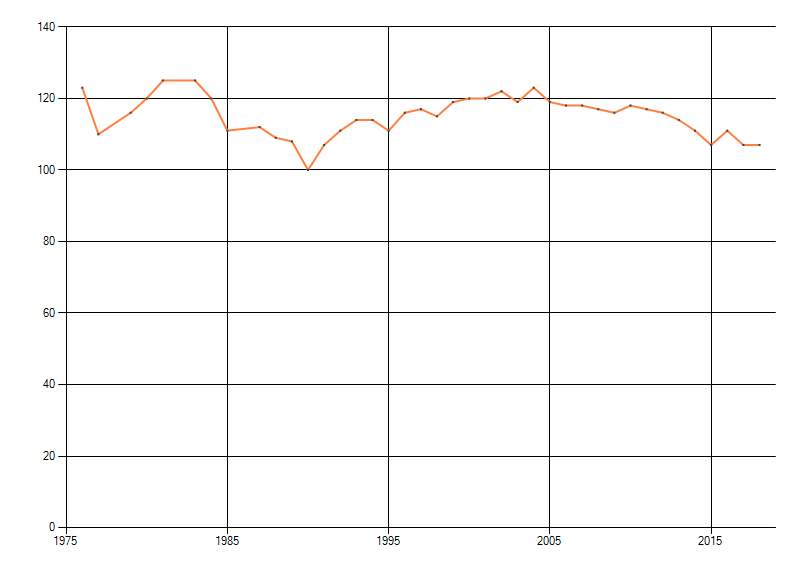 Gemiddelde trend van het aantal kilometerhokken waarin de soort voorkomt, weergegeven als indexcijfer (1975-1978 = 100). De trend is gecorrigeerd voor waarnemersinspanning en geeft de relatieve verandering in het aantal bezette kilometerhokken weer. Voor de berekening worden de data per periode van vier jaar samengenomen. In de grafiek correspondeert ieder punt met het laatste jaar van zo'n periode.