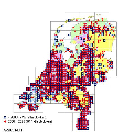 Het aantal atlasblokken (5x5 km) waarin de soort is gemeld binnen een periode van vijf jaar (vanaf 1980) of twintig jaar. Niet gecorrigeerd voor waarnemersinspanning en het aantal doorgegeven waarnemingen kan sterk variëren per periode, dus een trend in verspreiding kan hier niet direct uit worden afgelezen. Het opgegeven jaartal is het eerste jaar van de periode. Bron: gevalideerde waarnemingen uit de NDFF.
