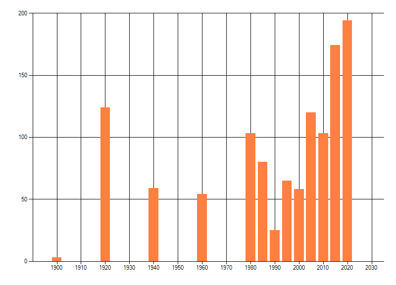 Het aantal atlasblokken (5x5 km) waarin de soort is gemeld binnen een periode van vijf jaar (vanaf 1980) of twintig jaar. Niet gecorrigeerd voor waarnemersinspanning en het aantal doorgegeven waarnemingen kan sterk variëren per periode, dus een trend in verspreiding kan hier niet direct uit worden afgelezen. Het opgegeven jaartal is het eerste jaar van de periode. Bron: gevalideerde waarnemingen uit de NDFF.