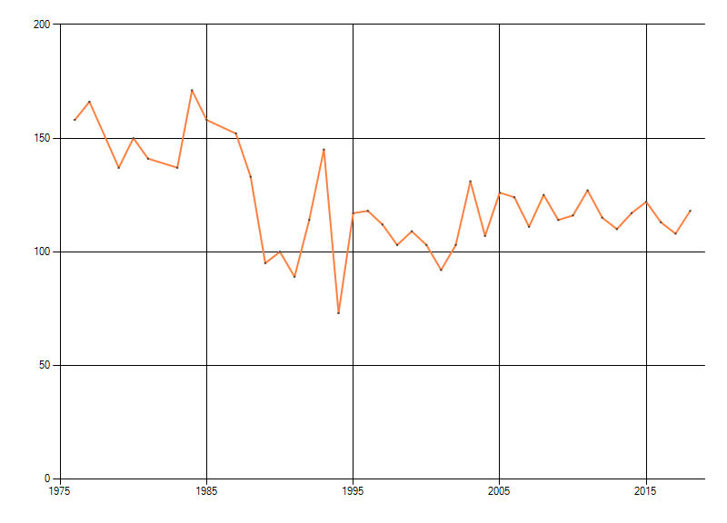 Gemiddelde trend van het aantal kilometerhokken waarin de soort voorkomt, weergegeven als indexcijfer (1975-1978 = 100). De trend is gecorrigeerd voor waarnemersinspanning en geeft de relatieve verandering in het aantal bezette kilometerhokken weer. Voor de berekening worden de data per periode van vier jaar samengenomen. In de grafiek correspondeert ieder punt met het laatste jaar van zo'n periode.