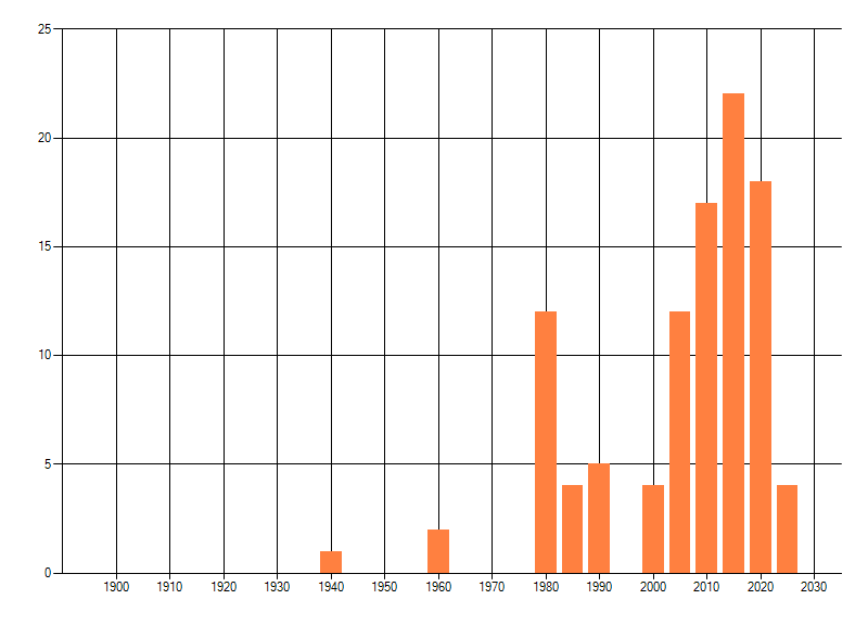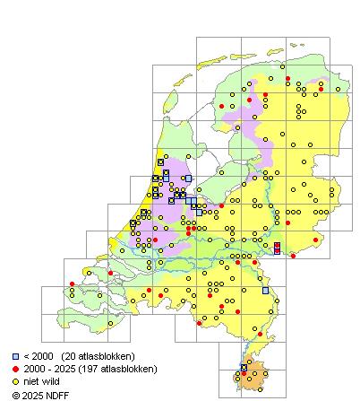 Het aantal atlasblokken (5x5 km) waarin de soort is gemeld binnen een periode van vijf jaar (vanaf 1980) of twintig jaar. Niet gecorrigeerd voor waarnemersinspanning en het aantal doorgegeven waarnemingen kan sterk variëren per periode, dus een trend in verspreiding kan hier niet direct uit worden afgelezen. Het opgegeven jaartal is het eerste jaar van de periode. Bron: gevalideerde waarnemingen uit de NDFF.