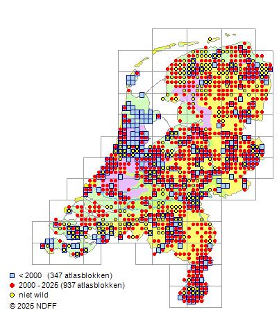 Het aantal atlasblokken (5x5 km) waarin de soort is gemeld binnen een periode van vijf jaar (vanaf 1980) of twintig jaar. Niet gecorrigeerd voor waarnemersinspanning en het aantal doorgegeven waarnemingen kan sterk variëren per periode, dus een trend in verspreiding kan hier niet direct uit worden afgelezen. Het opgegeven jaartal is het eerste jaar van de periode. Bron: gevalideerde waarnemingen uit de NDFF.
