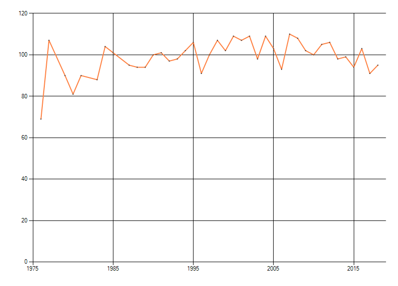Gemiddelde trend van het aantal kilometerhokken waarin de soort voorkomt, weergegeven als indexcijfer (1975-1978 = 100). De trend is gecorrigeerd voor waarnemersinspanning en geeft de relatieve verandering in het aantal bezette kilometerhokken weer. Voor de berekening worden de data per periode van vier jaar samengenomen. In de grafiek correspondeert ieder punt met het laatste jaar van zo'n periode.