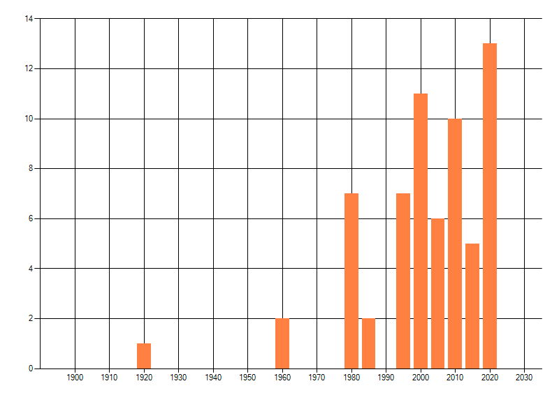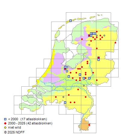 Het aantal atlasblokken (5x5 km) waarin de soort is gemeld binnen een periode van vijf jaar (vanaf 1980) of twintig jaar. Niet gecorrigeerd voor waarnemersinspanning en het aantal doorgegeven waarnemingen kan sterk variëren per periode, dus een trend in verspreiding kan hier niet direct uit worden afgelezen. Het opgegeven jaartal is het eerste jaar van de periode. Bron: gevalideerde waarnemingen uit de NDFF.