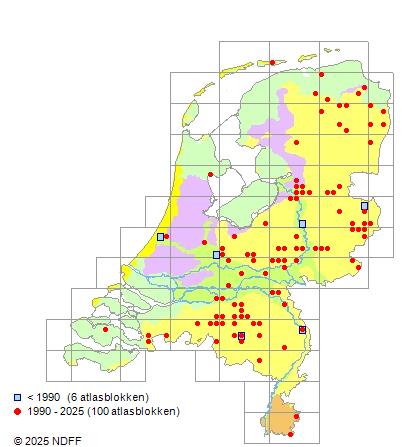 Het aantal atlasblokken (5x5 km) waarin de soort is gemeld binnen een periode van vijf jaar (vanaf 1980) of twintig jaar. Niet gecorrigeerd voor waarnemersinspanning en het aantal doorgegeven waarnemingen kan sterk variëren per periode, dus een trend in verspreiding kan hier niet direct uit worden afgelezen. Het opgegeven jaartal is het eerste jaar van de periode. Bron: gevalideerde waarnemingen uit de NDFF.