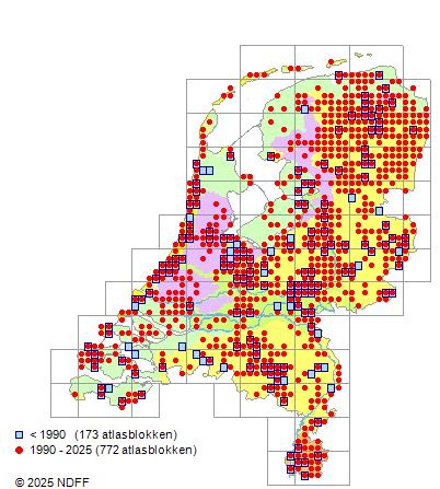 Het aantal atlasblokken (5x5 km) waarin de soort is gemeld binnen een periode van vijf jaar (vanaf 1980) of twintig jaar. Niet gecorrigeerd voor waarnemersinspanning en het aantal doorgegeven waarnemingen kan sterk variëren per periode, dus een trend in verspreiding kan hier niet direct uit worden afgelezen. Het opgegeven jaartal is het eerste jaar van de periode. Bron: gevalideerde waarnemingen uit de NDFF.